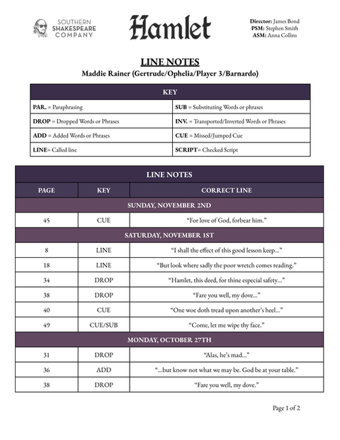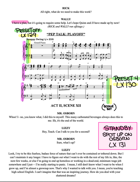 Therefore, when approaching the design elements in Stage Management, Anna focuses on ensuring even the smallest detail gets noted. She views her paperwork as a form of storytelling and interprets information through a narrative lens. When looking at a detail, she views it in an arc from the start to finish, considering how the element fits within a broader context and anticipating potential questions or needs. This approach is then reflected in her design process and creative philosophy, as her paperwork is meticulous attention to detail and thoughtfully communicated in order to transform the story and chaos of production into a shared, empowered vision.