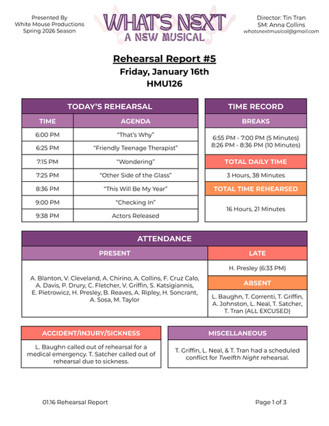 Her creative working philosophy centers around the power information holds. She heavily follows the "hit by a bus theory" in her approach to Stage Management, which centers around organizing information in a way that ensures yourself and others who step into the process are set up for success. For Anna, detailed documentation is not just a tool for efficiency but a form of empowerment. When information is crafted with care and precision, it builds trust within a team and guides each person toward the same goal. She finds this especially true when creating paperwork for crew members, using it to empower them to make informed decisions, ask questions, and identify additional needs. Thus, she writes down, organizes, and passes along the details she gathers to ensure communication remains open, consistent, and accessible to all.